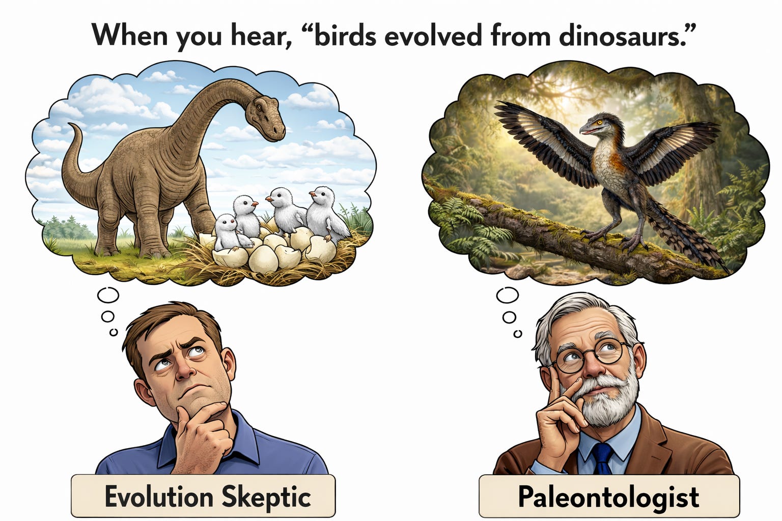Of course, when evolutionary theorists note that birds evolved from dinosaurs, they don’t mean doves suddenly hatched from the eggs of a sauropod. Instead, they contend that birds evolved from three-toed, tree-climbing theropods, whose scale-like skin filaments had evolved after many thousands of generations into longer and longer feathers. In other words, they contend birds evolved from Archaeopteryx-like theropods—not from a sauropod or a Stegasaurus.