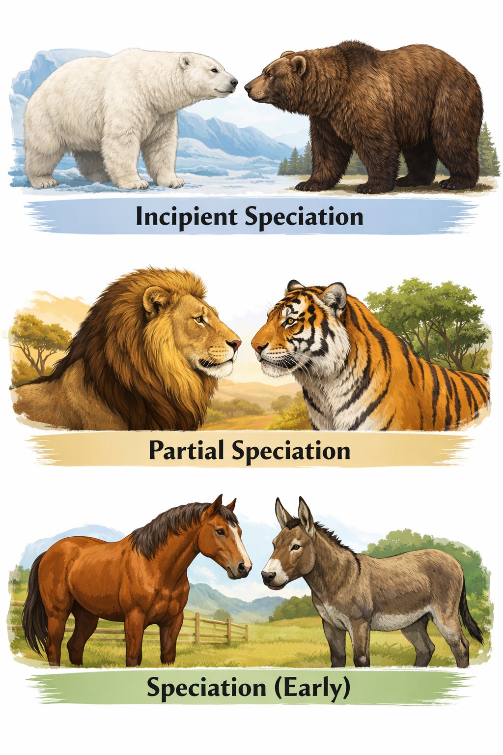 Incipient Speciation: Early on, the two populations are still genetically very similar. They can usually still interbreed if they meet, and their offspring are viable and often fertile. This stage is called incipient speciation. Reproductive isolation exists, but it is weak and often indirect. Polar bears and grizzly bears illustrate this stage. They diverged relatively recently, occupy different ecological niches, and rarely meet in the wild. But when they do, they can produce viable hybrids. That compatibility tells us the genetic separation is still shallow.