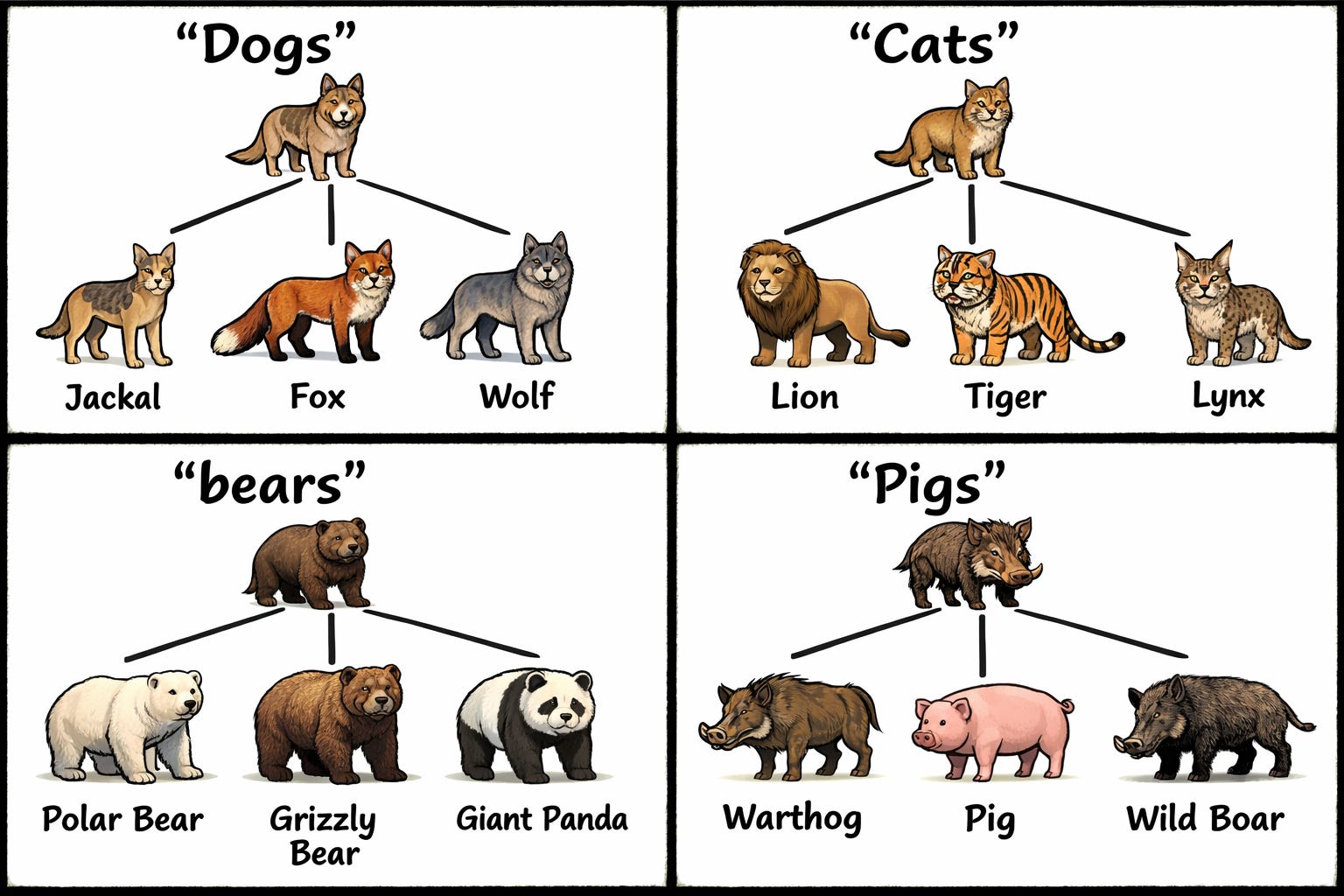 In his response to my island-evolution comic, Vox Day argued that the Galápagos finches—dark ground finches, warbler finches, etc—are all related, just as the land and marine iguanas are. And, again, we can also say these are all the same “form.” Dogs are still dogs; finches are still finches; iguanas are still iguanas. And, of course, we can also make a similar claim with the following illustration of evolutionary trees: bears are still bears; cats are still cats; pigs are still pigs.
